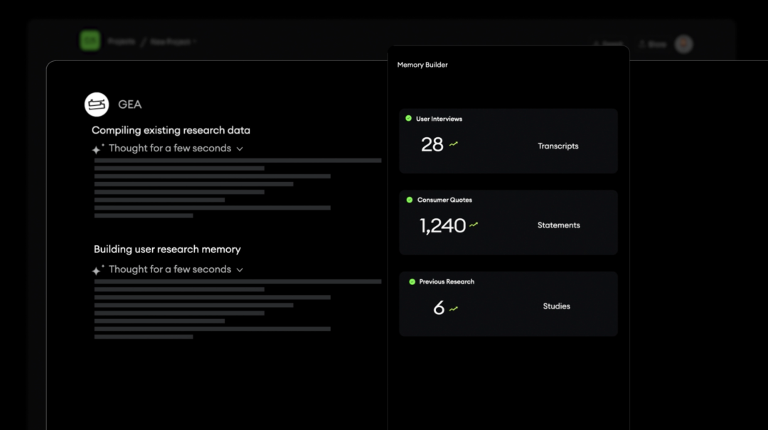第二层是决策模拟。当需要验证一个产品方向时,GEA 组织 AI Panel,让不同背景的 AI Persona 围坐讨论,暴露决策中的冲突点。再通过 AI Interview 做一对一深挖。